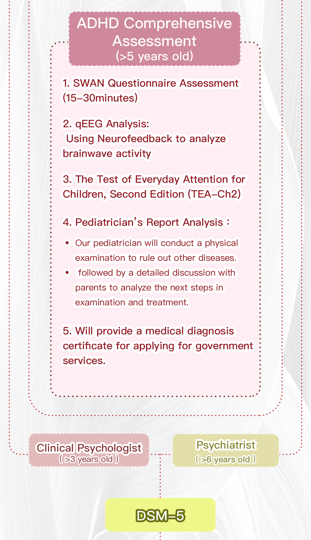 Our medical team uses not only locally common screening tools but also internationally recognized screening tools and child development scales. These tools are combined with various modules and high-standard validations. Additionally, to better understand the child’s condition, we utilize various quantitative screening tools and systems for analysis, adhering to gold-standard diagnostic procedures to refine diagnoses and provide optimal treatment.